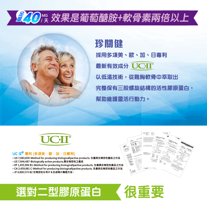※ UC-II®膠原蛋白複合物專利 US7083820, US7846487, US 9066926,EPO EP 1435906B1,CA 2459981C, JP 4800574B2以及全球多項專利申請中。