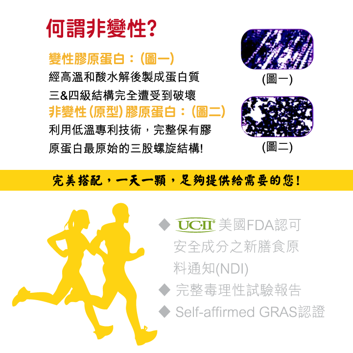 ※ UC-II®膠原蛋白複合物專利 US7083820, US7846487, US 9066926,EPO EP 1435906B1,CA 2459981C, JP 4800574B2以及全球多項專利申請中。